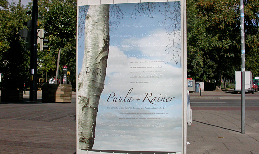 Das Plakat ist grafischer Ausgangspunkt einer Marketing-Kampagne, die eine Lesung des Briefwechsels der beiden Künstler Paula Modersohn-Becker und Rainer Maria Rilke bewirbt.