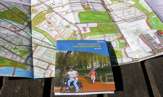 Bei den Plänen, die es bislang für drei Stadtgebiete gibt, geht es um eine kindgerechte Darstellung der Schulumgebung, damit sichere Schulwege ausfindig gemacht werden können. Zusätzlich wird sowohl aufgezeigt, wo Spiel- und Bolzplätze sind, aber auch mit Warnsymbolen darauf hingewiesen, wo besonders aufgepasst werden muss.