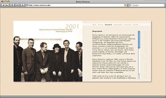 Große Bilder links, Informationen rechts, die Navigation in einem schmalen Balken oben, dazu die Farben der Küstlerin, warme Brauntöne und eine Terminseite, die Romy Camerun selber aktualisieren kann, charakterisieren diese Homepage.