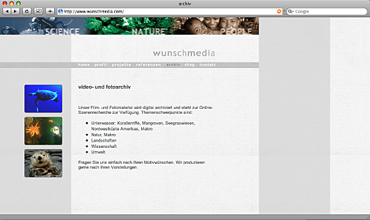 Wunschmedia produziert Dokumentationen für Fernsehen, Bildung und interaktive Medien. Die Website ist elegant gestaltet und bietet schnelle, übersichtliche Informationen sowie viele Kostproben der faszinierenden Naturfotografien.